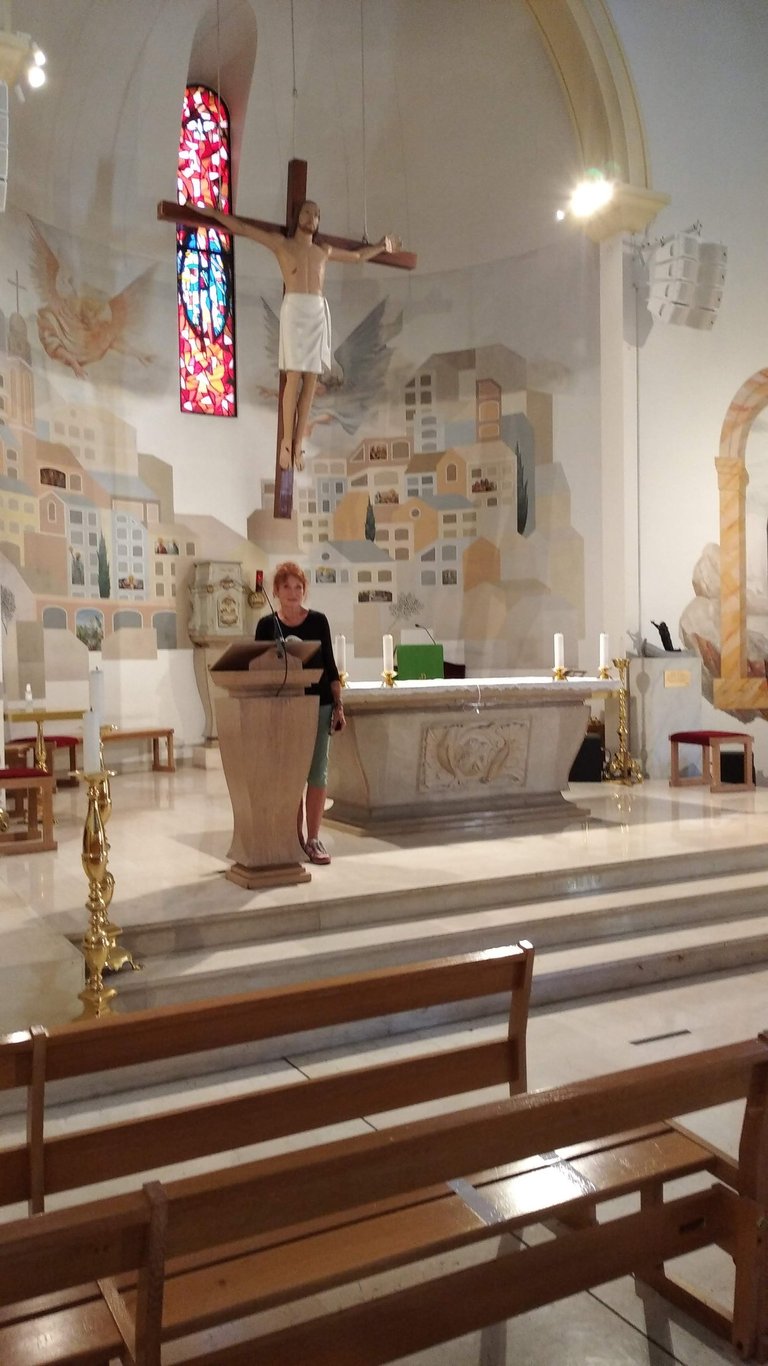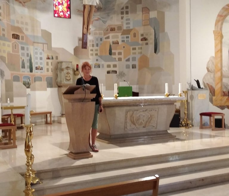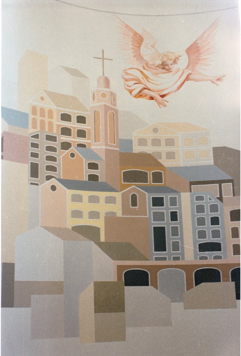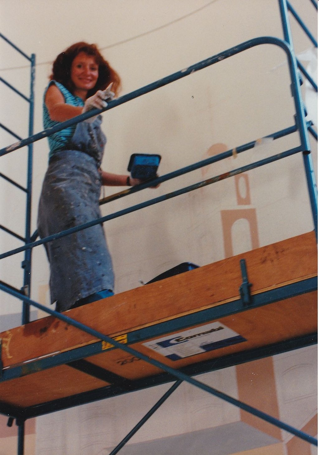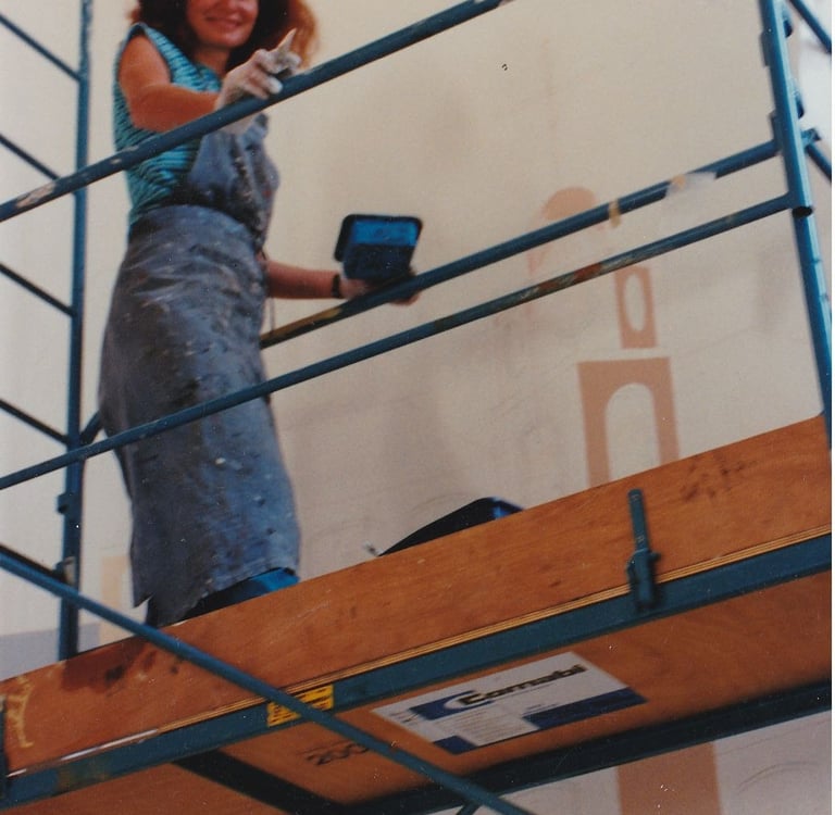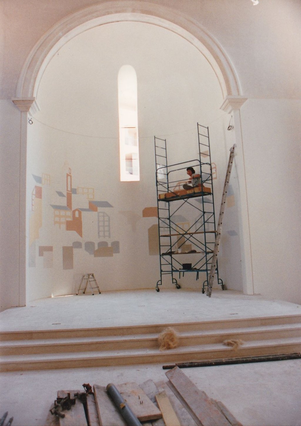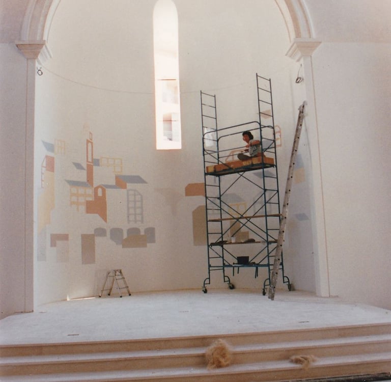 France Cruse, pendant la réalisation de la grande fresque dans le chœur.
