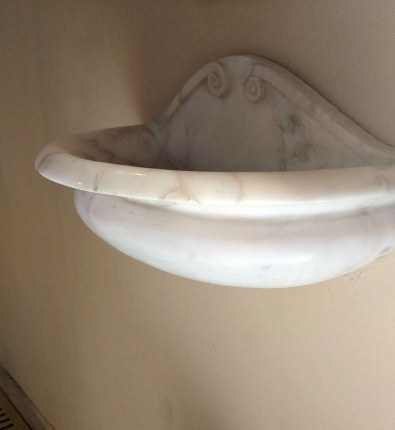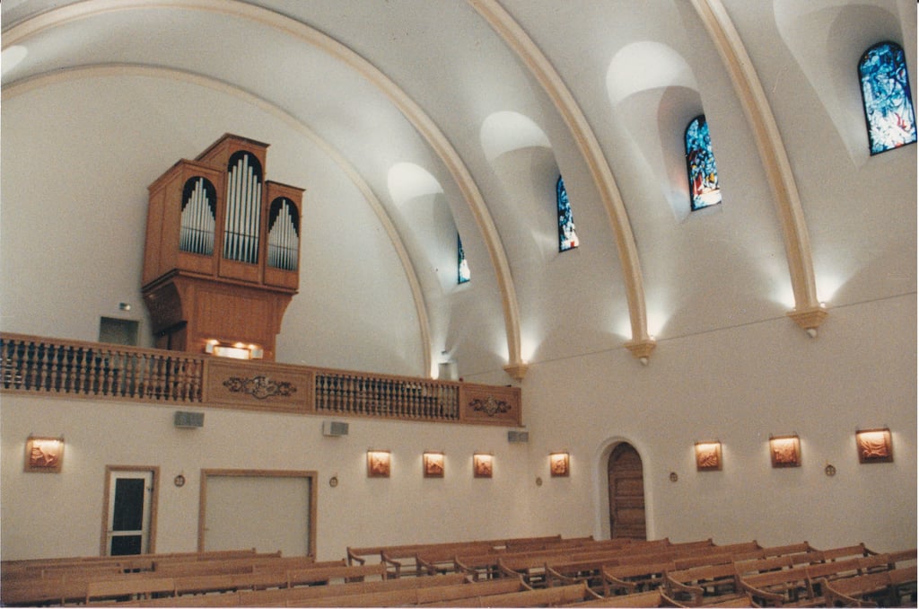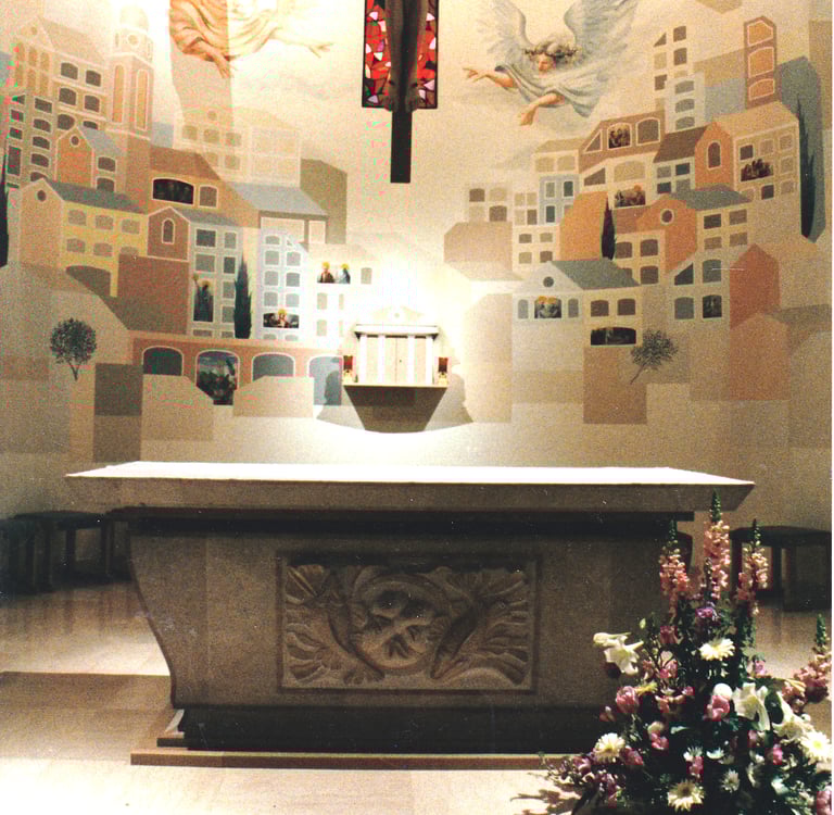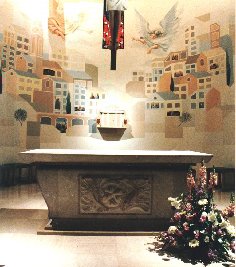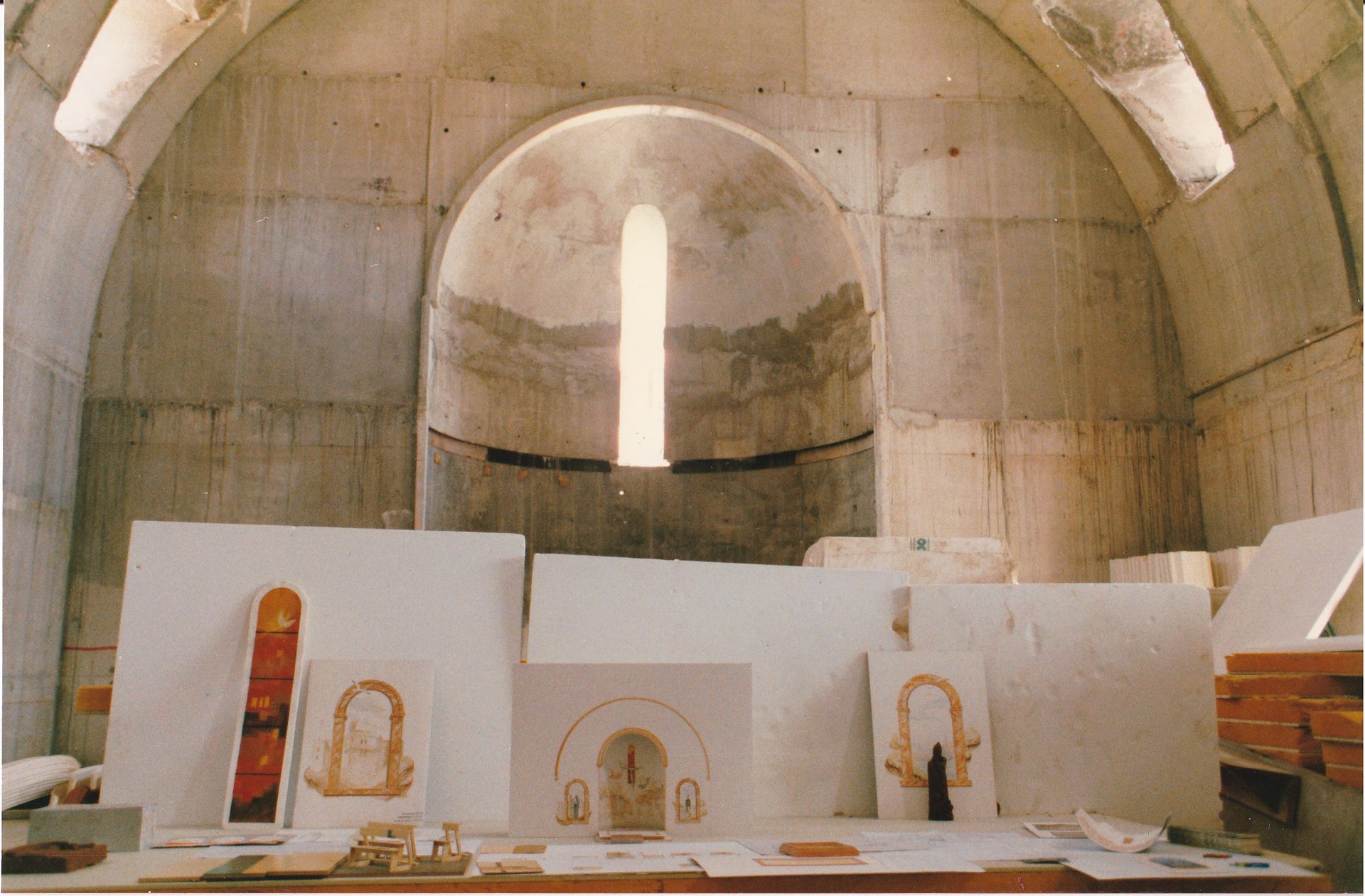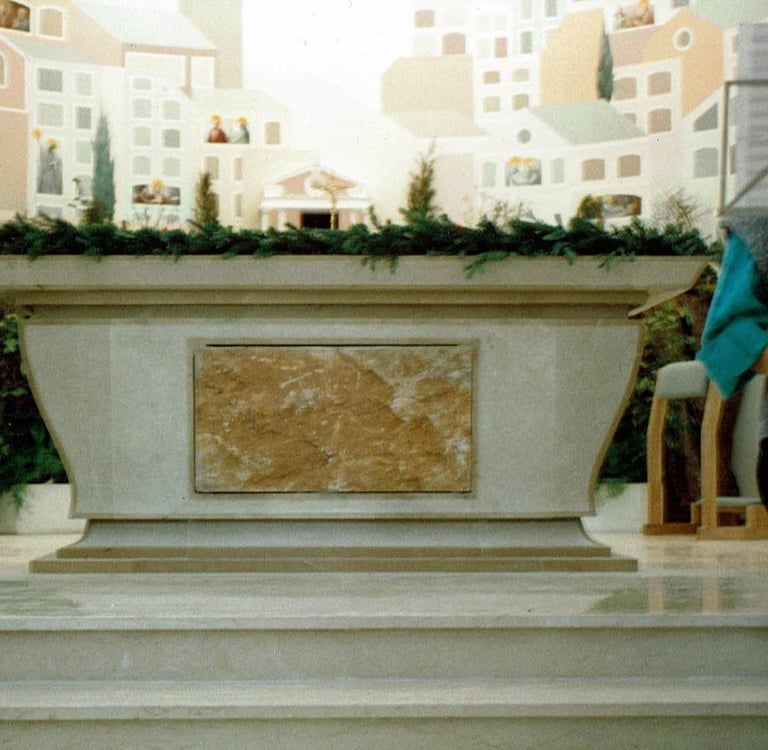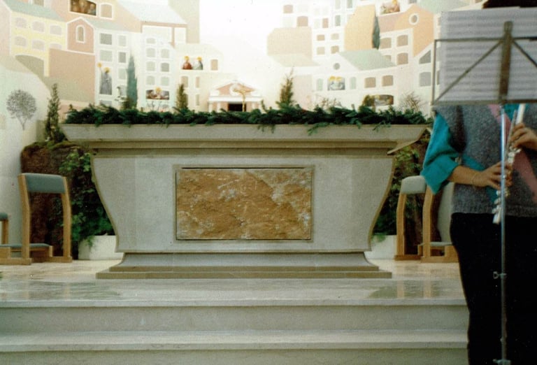 L'autel dessiné par France Cruse, avant la pose du bas relief. Réalisé en pierre de la Turbie, qui a été bouchardée, ciselée et polie.