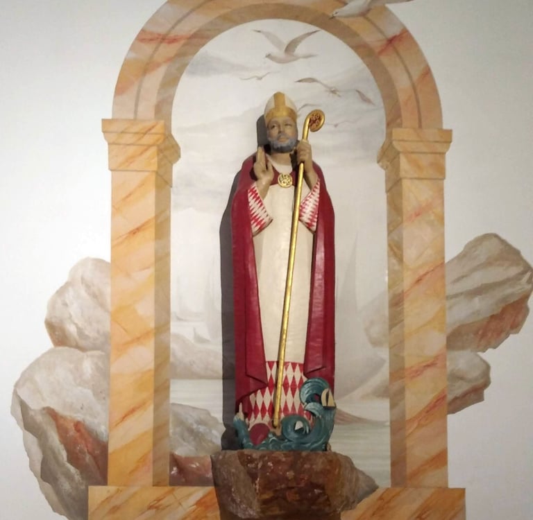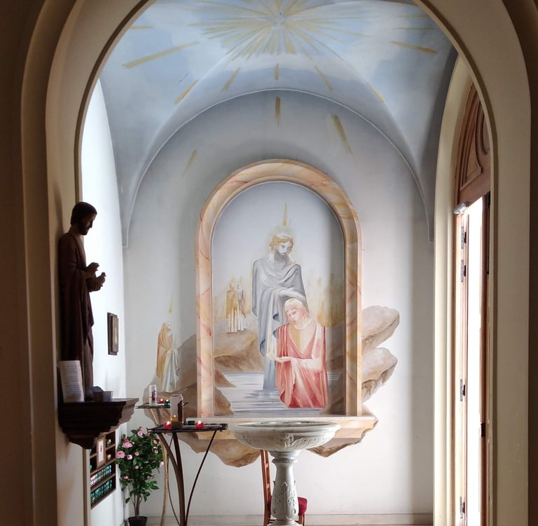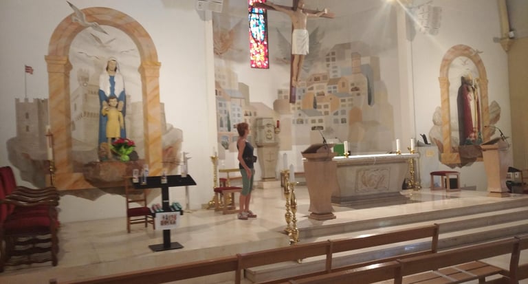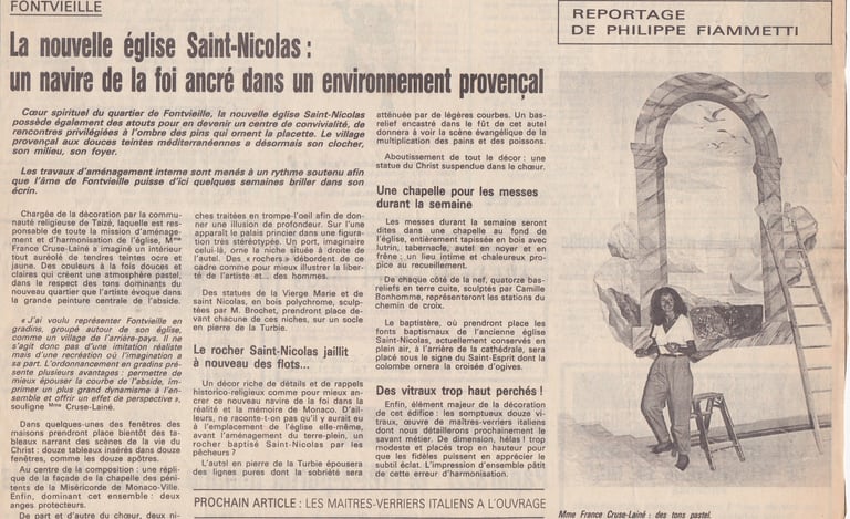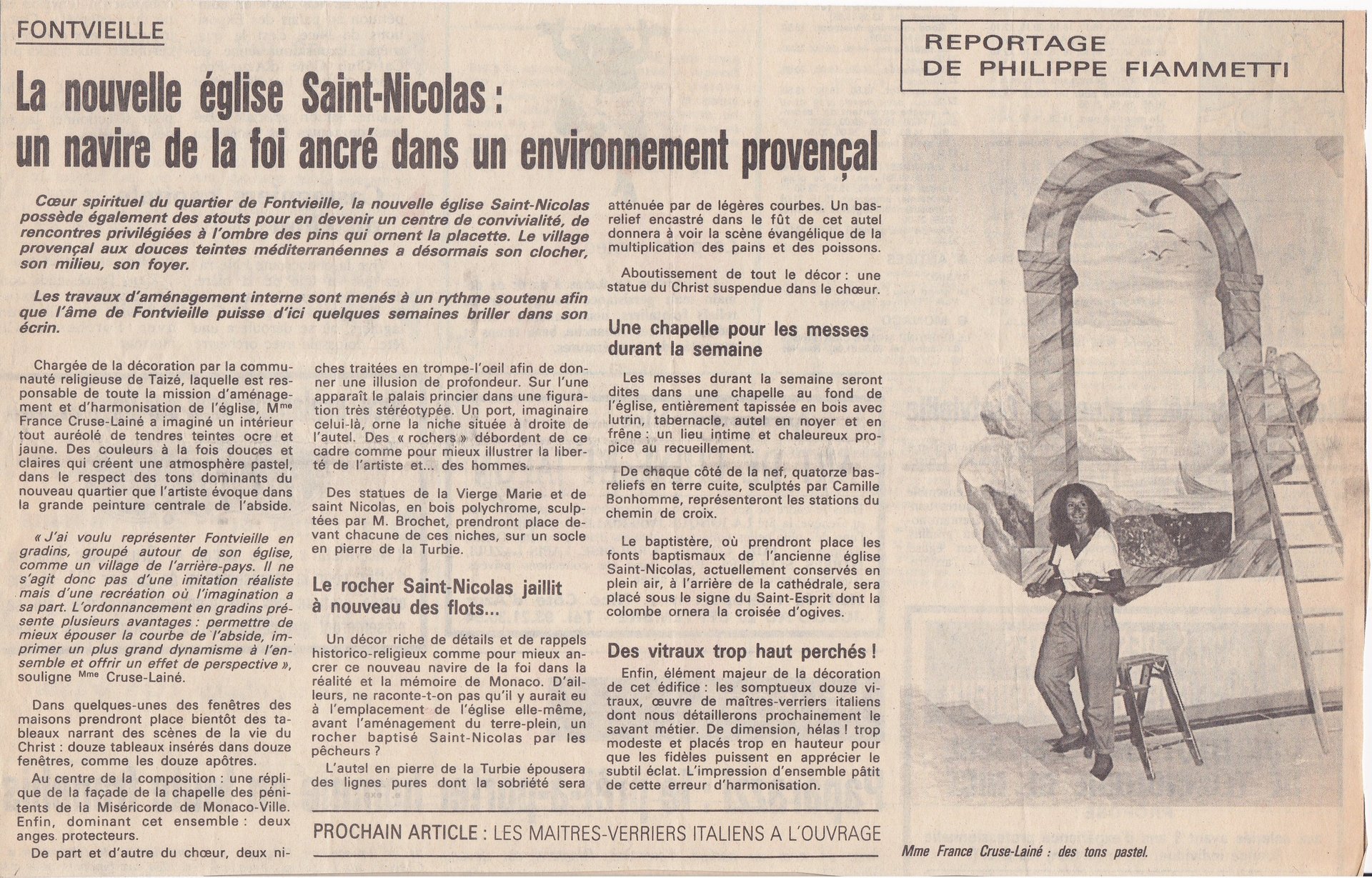 A l’issue d’un concours, France Cruse a été chargée de la coordination de la décoration intérieure de l’église Saint Nicolas de Fontvieille dans la principauté de Monaco. Elle a réalisé la fresque dans le chœur, les trompes l’œil pour mettre en valeur les statues, en particulier celle de Saint Nicolas, le mobilier liturgique, l’autel, ainsi qu’un bénitier que France a dessiné et pour lequel elle a choisi la pièce de marbre à Carrare.