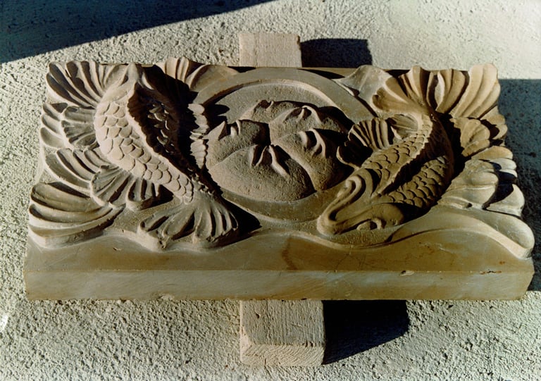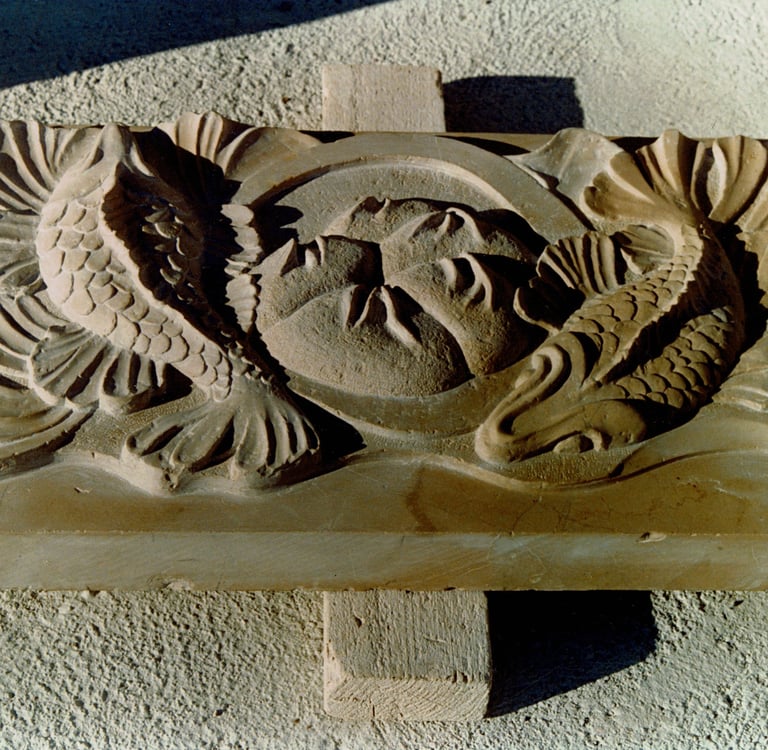 Bas relief destiné à l'autel représentant la parabole de la multiplication des pains (cinq pains et deux poissons). Réalisé en pierre de Bourgogne.