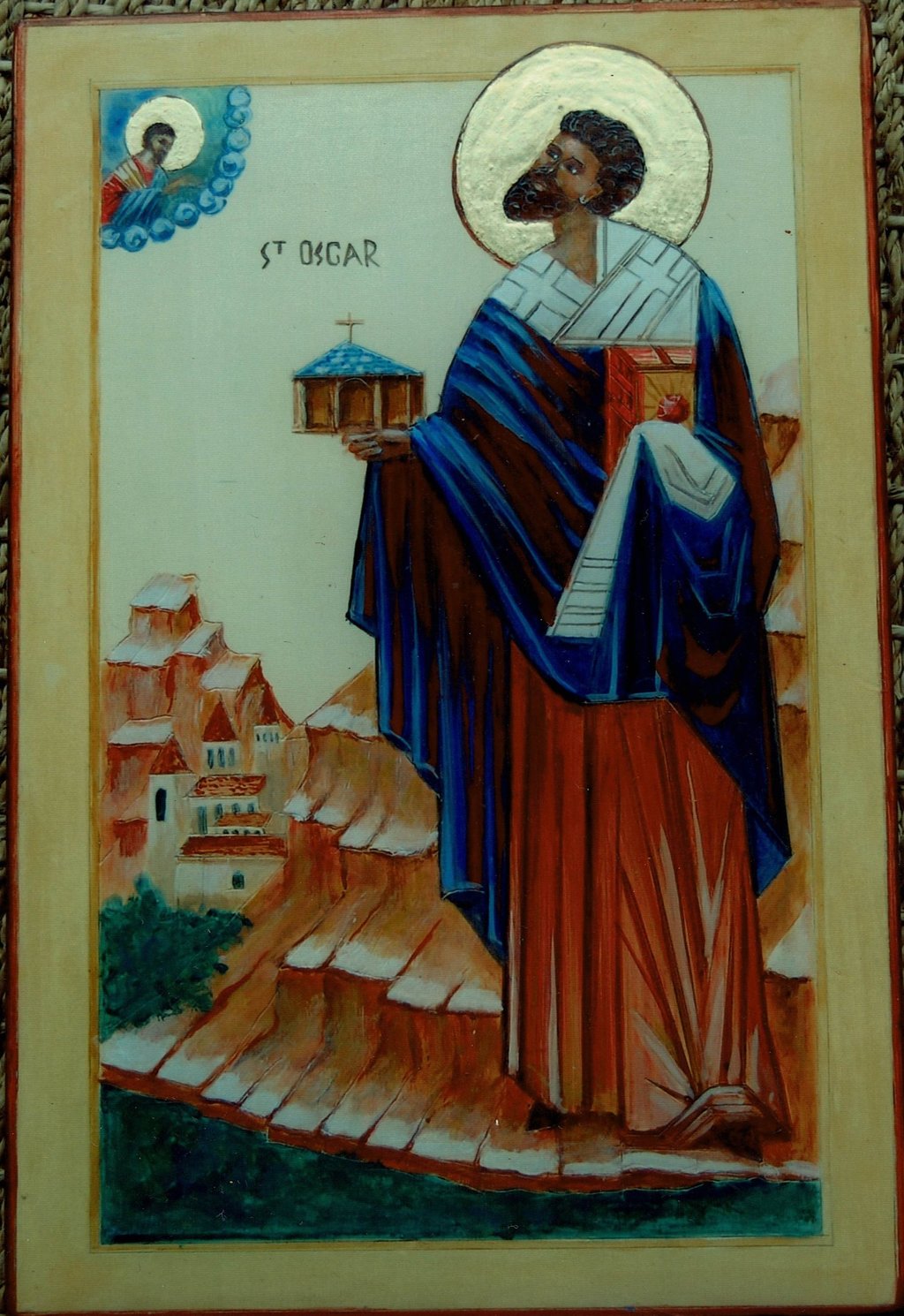 Il a été à l'origine des prémisses de l'évangélisation de l'Europe du nord. Il tient l'abbaye de Corbie dans sa main.