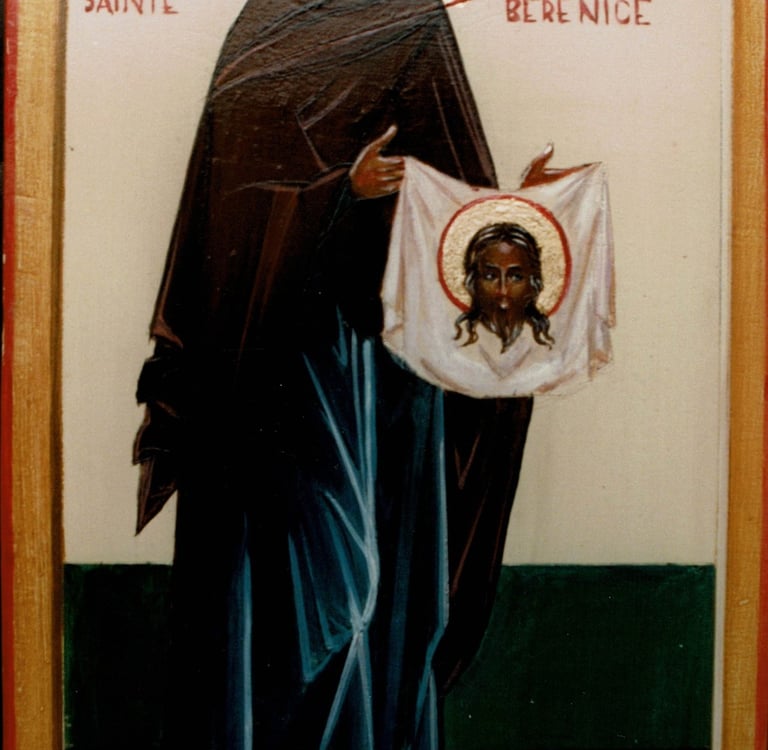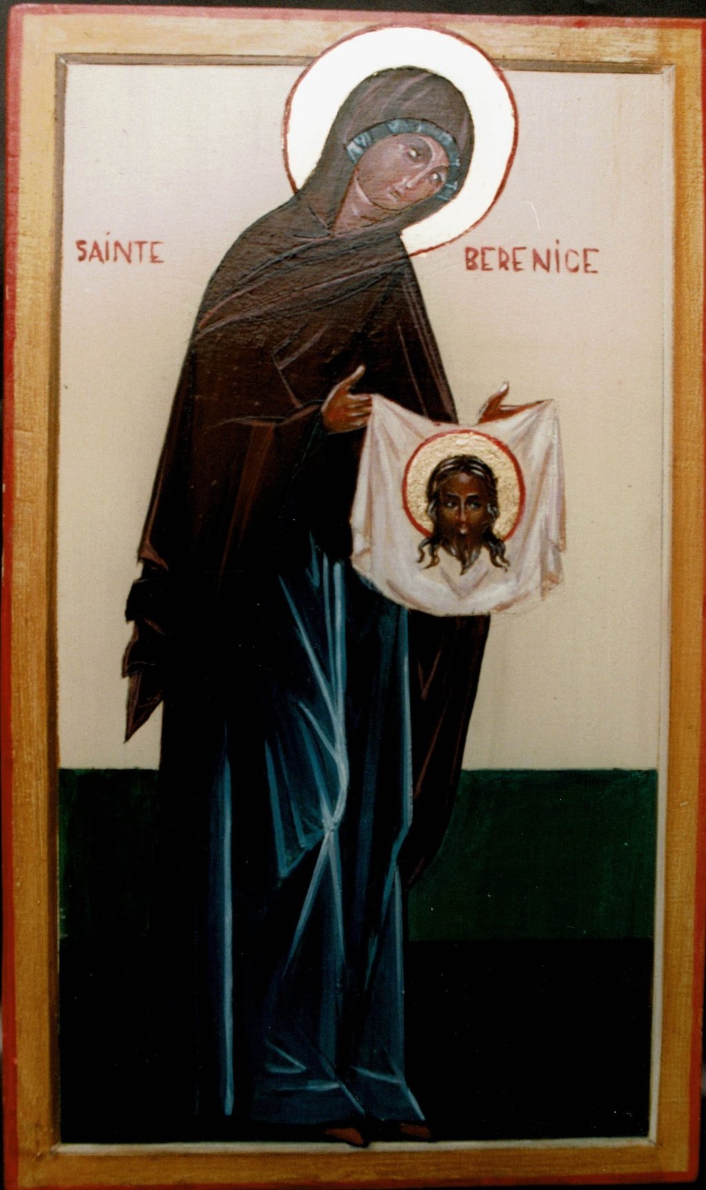 Bérénice donna un linge au Christ afin qu'il éponge son visage lors de son chemin de croix. Selon la légende, le portrait du Christ apparu miraculeusement sur ce linge.