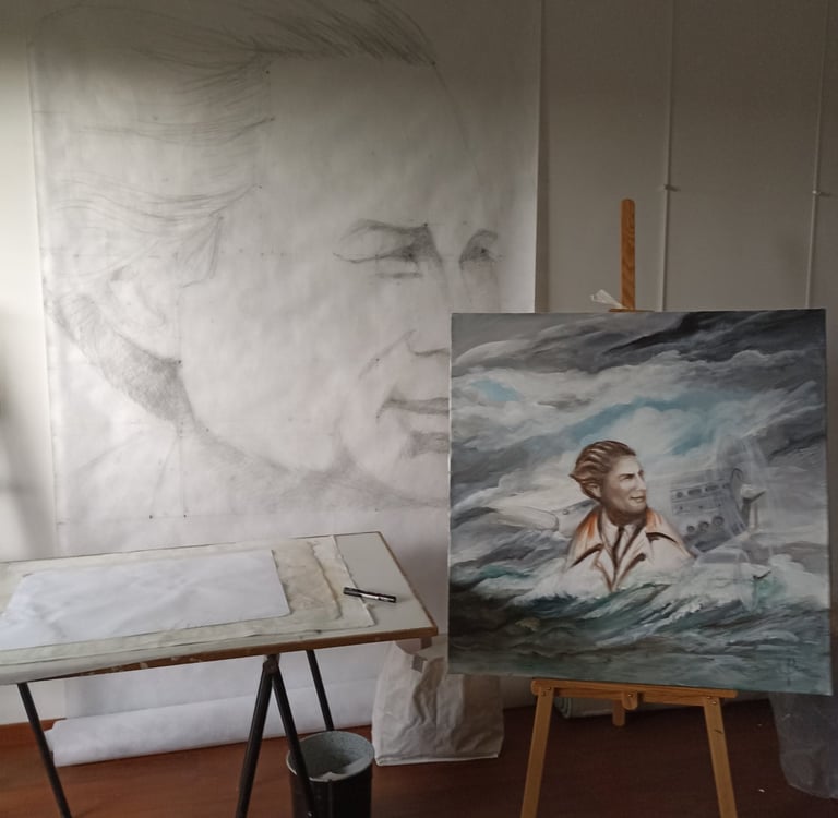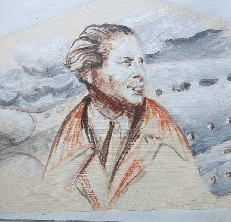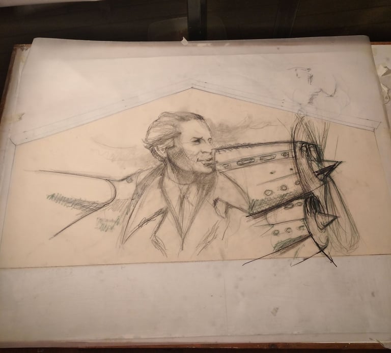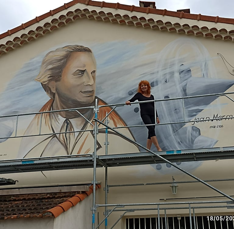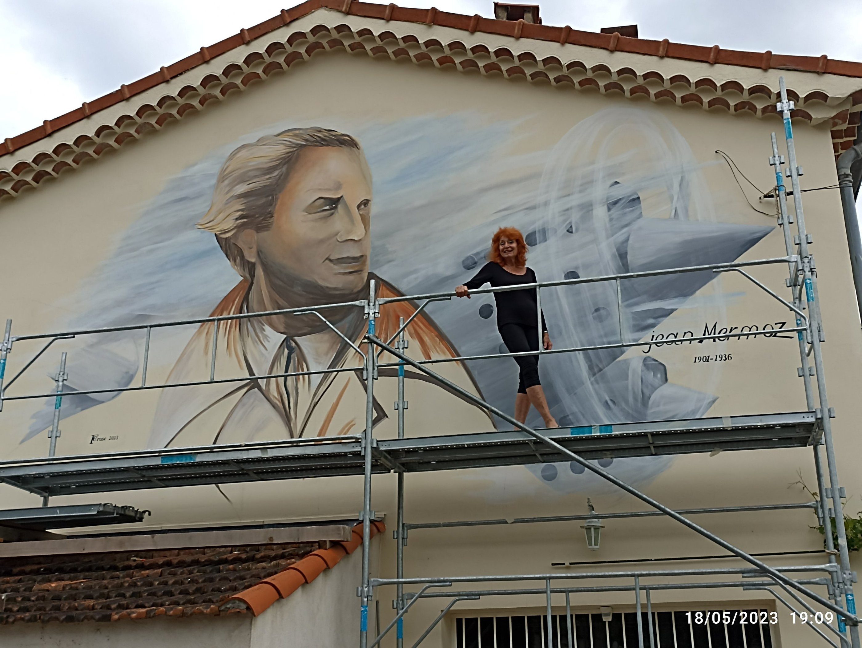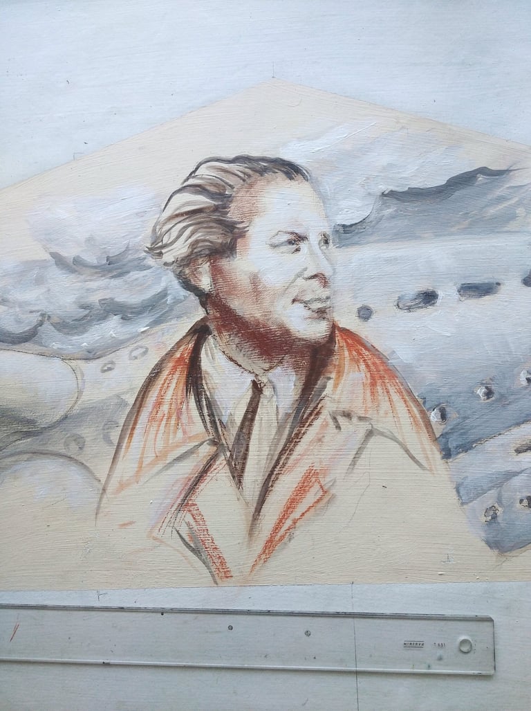 Portrait de Mermoz par France Cruse. Au fond, portrait à l'échelle de la fresque.